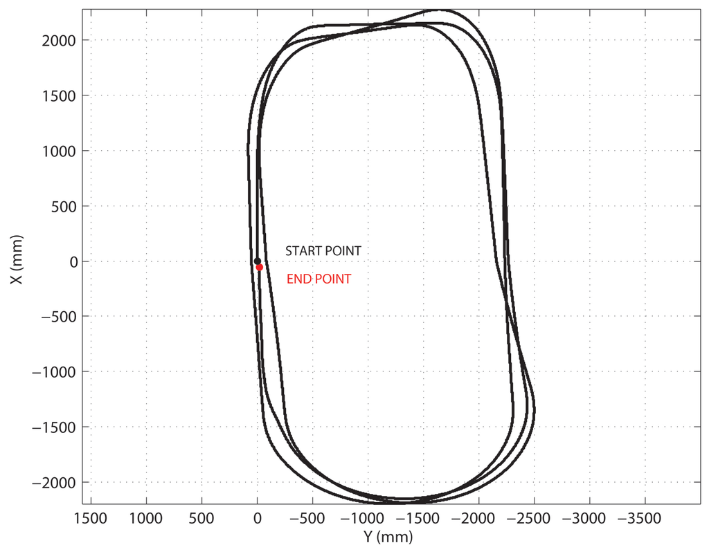 Path of the rover in a typical closed-loop run as derived by gyro-odometry, i.e., linear and angular displacements were obtained by encoders and gyro, respectively