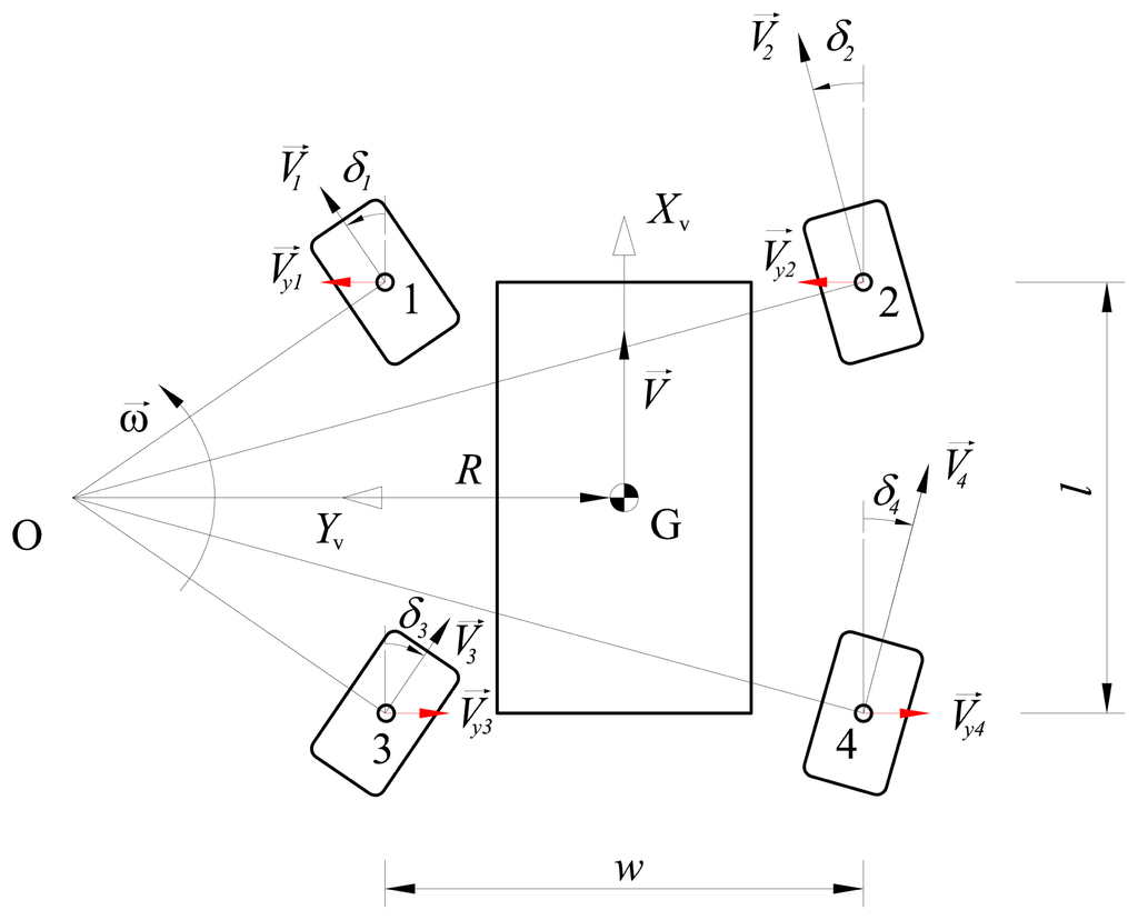 Under the assumption of symmetric steering, the magnitude of the lateral velocity component has to be equal for the front and rear wheel pairs, i.e., Vy,f = Vy,r = Vy. Note, however, that the direction of the lateral velocity component for the front wheels is opposite to that of the rear wheels.