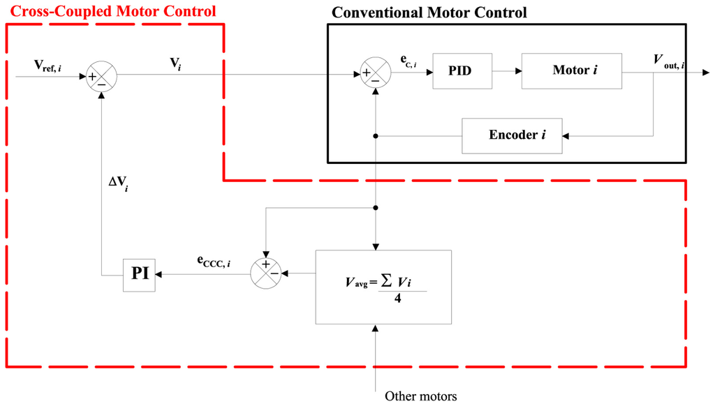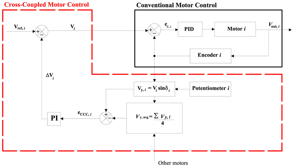 Figure 3 shows a block diagram with the implementation of the cross-coupled control for one wheel of the rover. The scheme is the same for the remaining wheels and it is not reported. Based on the estimation of the wheel velocities Vi (i = 1,…, 4) by encoders, the vehicle speed can be calculated by