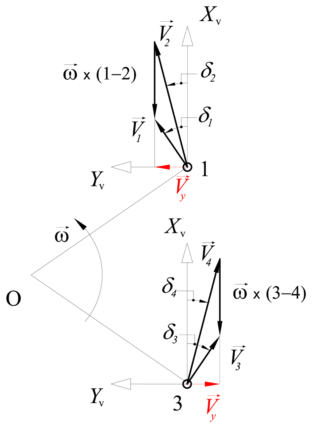 During turning maneuvers, each wheel travels with a velocity proportional to the distance from the instantaneous center of rotation, i.e., the inner wheels are slower than the outer wheels, as shown in Figure 2. However, the projection of wheel velocities along the y-axis of the vehicle must be equal in absolute value in order to ensure a correct kinematic behavior. This can be proved via graphical velocity analysis of the rover, as illustrated in Figure 4. The vector relationships between the velocities of the front and rear wheel pairs are respectively