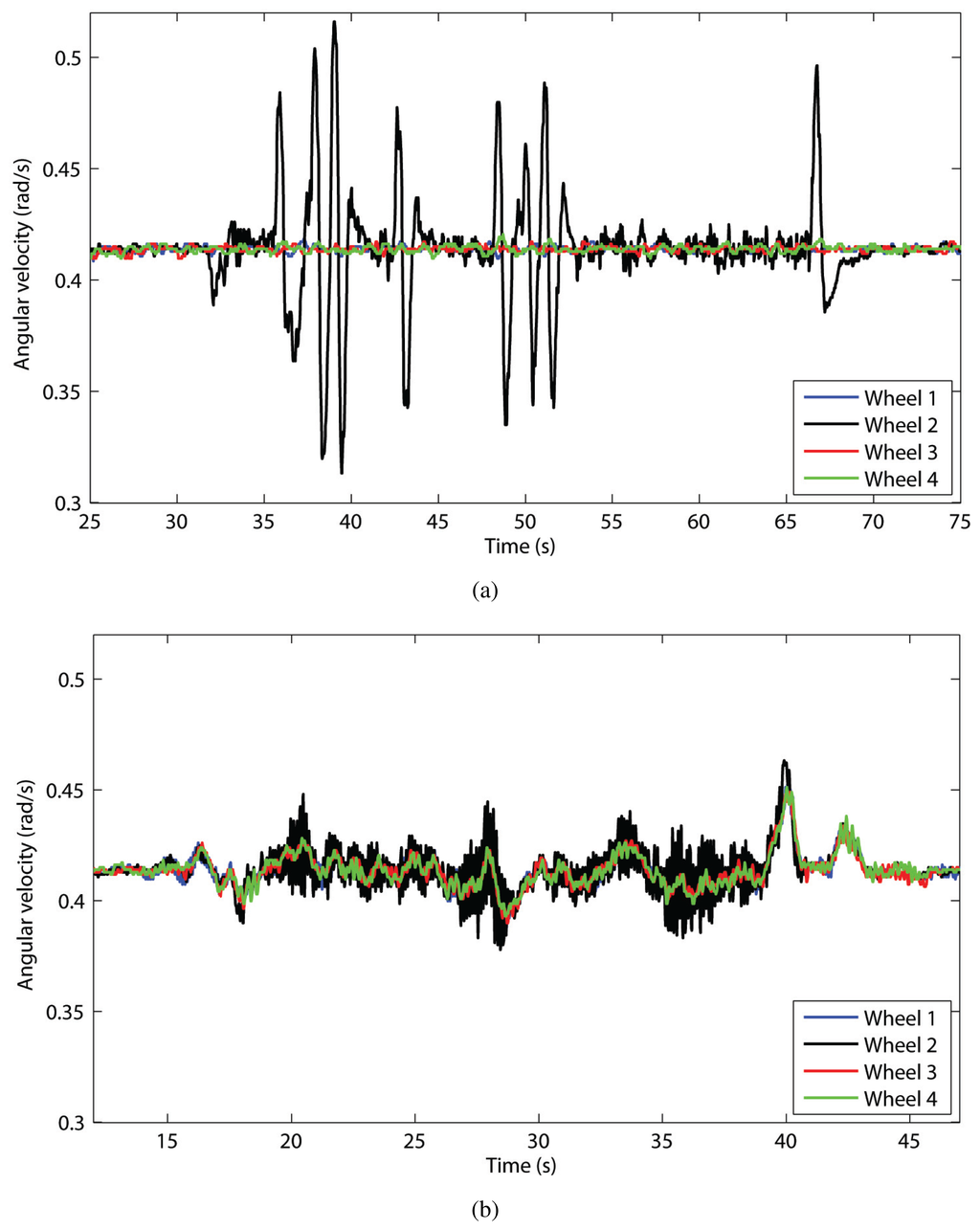 The main idea behind the cross-coupled approach can be explained with a preliminary experiment where the rover was commanded to drive straight forward as braking torques were applied to one of the wheels, i.e., Wheel 2, in order to introduce random disturbances into its control loop. As shown in Figure 7(a), under conventional controller (CC) large differences in the wheel velocities were produced with consequent, undesired increase in the amount of slippage. This effect is due to the lack of communication between the control loops. The conventional control was implemented as a standard Proportional-Integral-Differential (PID) controller, as customary in many robotic platforms. The application of the cross-coupled control strategy improved the rover's behavior as shown in Figure 7(b). In contrast to conventional control, the cross-coupled controller compares all control loops instant by instant (a sampling interval of T = 0.01 s was used) decreasing the wheel velocities that are higher and increasing the wheel velocities that are lower. The overall result is a better synchronization of all wheel velocities with a consequent minimization of slippage.