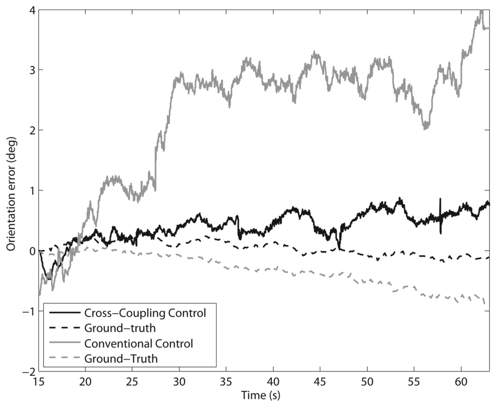Tests were first performed along a 5-meter straight path with a constant travel speed of 10 cm/s. Six runs with each control method were performed. Figure 8 shows a comparison of the typical orientation error growth using the CC (marked by a solid grey line) and the CCC (denoted by a solid black line) controllers in a sample run. The encoder-derived measurement (solid line) is compared with the actual heading change (dashed line), provided by a fiber-optic gyro aligned along the vertical axis of the vehicle that is used as the ground truth in this type of experiments. In order to gain an indication of the error accumulation, the final orientation error is considered as obtained from the odometry at the end of each run. The mean final orientation error and standard deviation in all experiments resulted in 3.8 ± 0.8 deg under CC, and 0.7 ± 0.2 deg using CCC. It is apparent from these results that using a conventional PID controller the orientation error continuously increases, while, under cross-coupled control, a correction signal is generated when discrepancies between the wheel velocities are detected, thus reducing the rover orientation error.