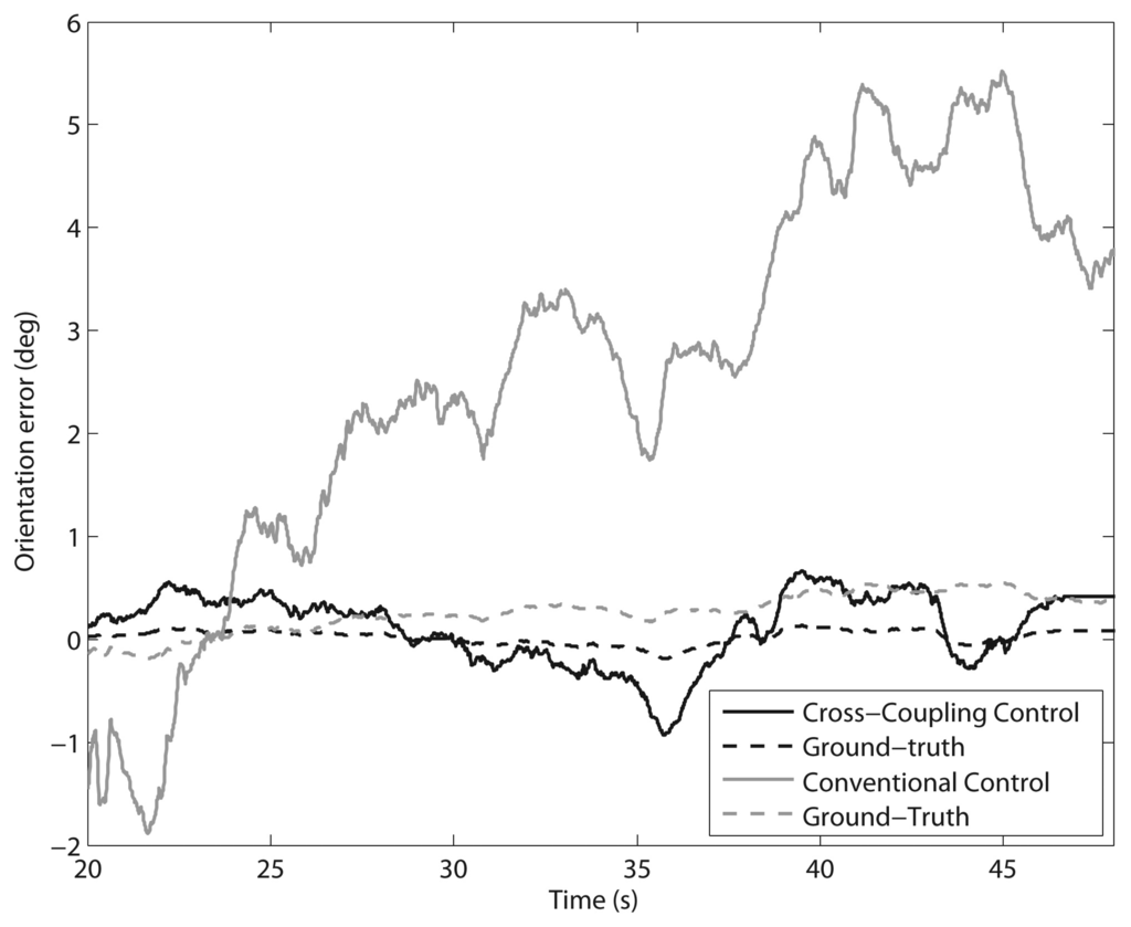The advantage of the CCC system is also confirmed when considering higher traction surfaces. Figure 9 shows the results of a typical 5-meter straight path test performed on road asphalt with a constant travel speed of 10 cm/s, using the CC (marked by a solid grey line) and the CCC (denoted by a solid black line) controllers. Again, ground truth was provided by a fiber-optic gyro (dashed lines). Using the conventional approach, the orientation error growth is much higher than when adopting cross-coupled control that, in contrast, ensures tight synchronization of all wheel velocities.