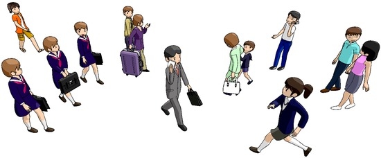 - Ge, W.; Collins, R.T.; Ruback, B. Vision-based analysis of small groups in pedestrian crowds. IEEE Trans. Patt. Anal. Mach. Intell. 2012, 34, 1003–1016. [Google Scholar]