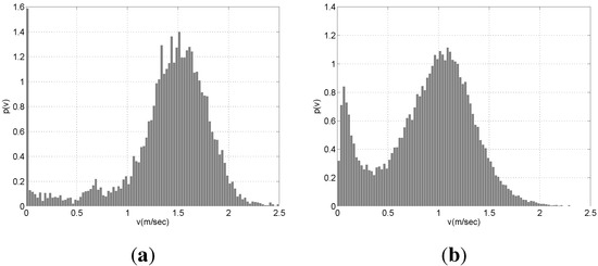 Obviously, in order to define a meaningful value for θ, the pedestrians should be moving with a velocity larger than a reasonable threshold. We picked this value examining the distribution of velocity for all people in the environment (see Figure 4). In BrWI-ETH dataset the people who wait at the tram station have low velocities distributed more or less uniformly over 0 to 0.5 m/s. On the other hand, there are basically two peaks in velocity distribution for APT dataset. The first peak is entered around 0.1 m/s and it relates the people who are watching the shelves, whereas the second peak is centered around 1.2 m/s and it relates the people who walk steadily. Nevertheless, the number of these people is quite low compared with the steadily walking pedestrians. Thus, we picked 0.375 m/s as velocity threshold.