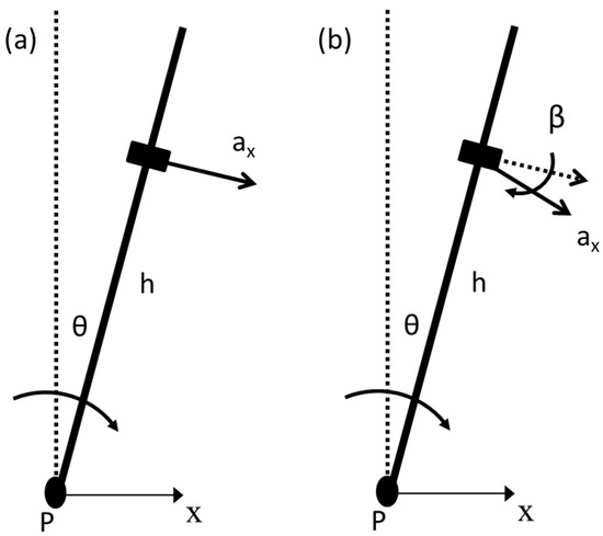 An IP model in 2D is analyzed. A SAA is placed at height h from the pivot point P with the sensitive axis orthogonal to the longitudinal axis of the IP (Figure 1(a)). The accelerometer output, ax(t) can be expressed in the continuous-time domain as the sum of an inertial contribution depending on the angular acceleration component, α(t) (the second derivative of the sway angle, θ(t)) and a gravitational term depending on the sway angle, as follows: