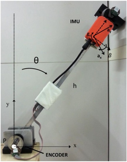To test the method, the same experimental setup used in [19] was adopted. An aluminum rectangular link was used as an IP driven by hand to sway with a fixed pivot point. The frequency content of the angular sway is [0–2] Hz. Five trials were performed. The mechanical arm was equipped with an absolute encoder (Gurley, mod. 7700, resolution 19 bit, Gurley Precision Instruments, Troy, NY, USA) and an IMU (MTx, Xsens Technologies, Eschede, The Netherlands), consisting of a tri-axial accelerometer, a tri-axial gyroscope and a tri-axial magnetometer, placed at height h = 0.20 m from the pivot point P (Figure 3).