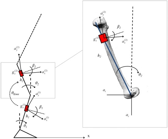 The outputs of the sensor placed on the thigh can be evaluated by modifying Equation (10) by adding the projection of the accelerations at and ac on the measurement axis of the sensor.