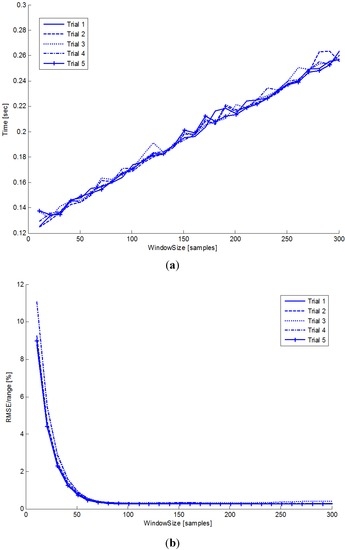 A good trade-off between the algorithm's speed and accuracy may be obtained by using Figure 6 which shows the effect of the window size W on the time required to process 50 s of the signal in Figure 6(a), and on the percentage ratio between RMSE and peak-to-peak range in Figure 6(b).