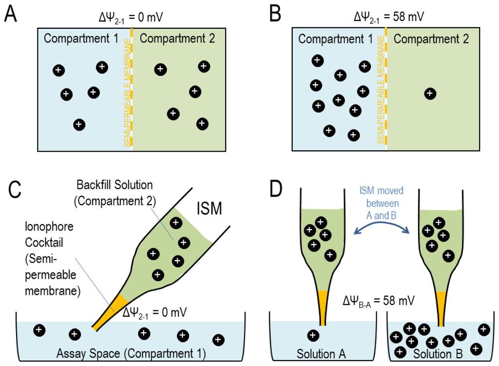 Now, let us imagine two compartments 1 and 2 that are separated by a selectively-permeable barrier such as a cell membrane or an ionophore cocktail that permits selective permeation of a certain ion (shown in Figure 1, panels A and B).