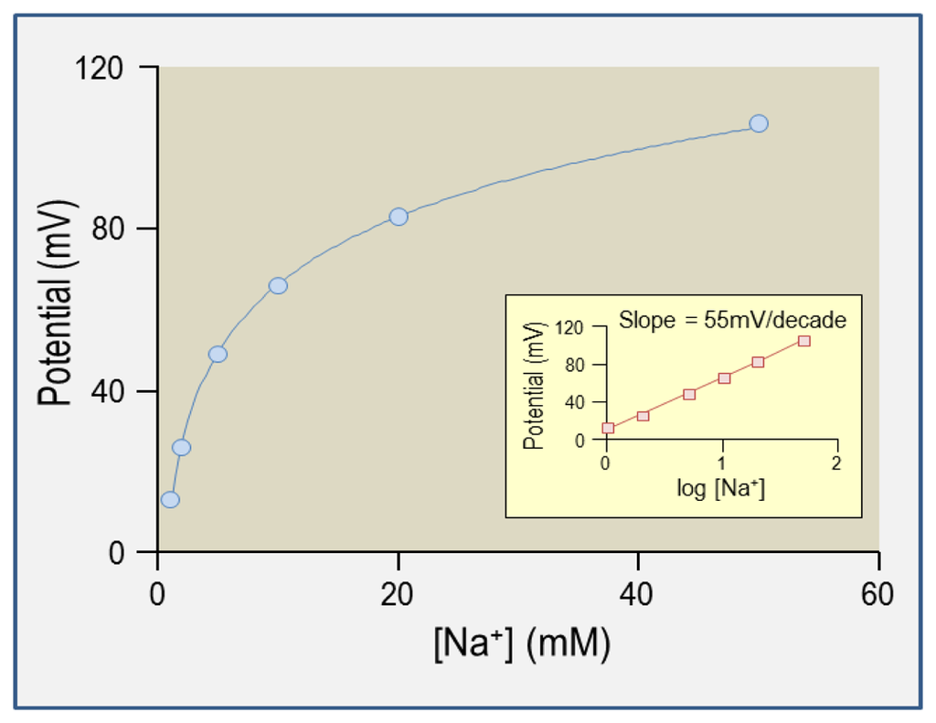 Example calibration plot for an intracellular Na+-selective microelectrode gathered using NaCl solutions.