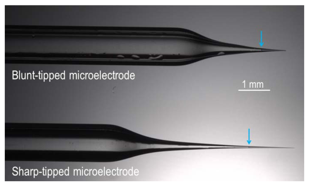 Micrograph of blunt-tipped and sharp-tipped microelectrodes taken with a M205A Stereomicroscope (Leica Microsystems, Buffalo Grove, IL, USA). Blue arrows show ionophore-cocktail meniscus.