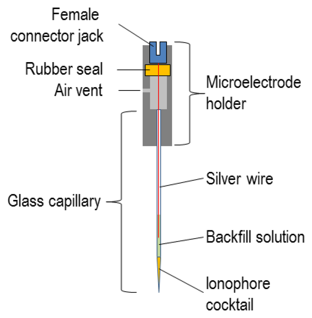 - Voipio, J.; Pasternack, M. Ion-selective microelectrodes. In Microelectrode Techniques; Company of Biologists: Cambridge, UK, 1994; pp. 275–315. [Google Scholar]