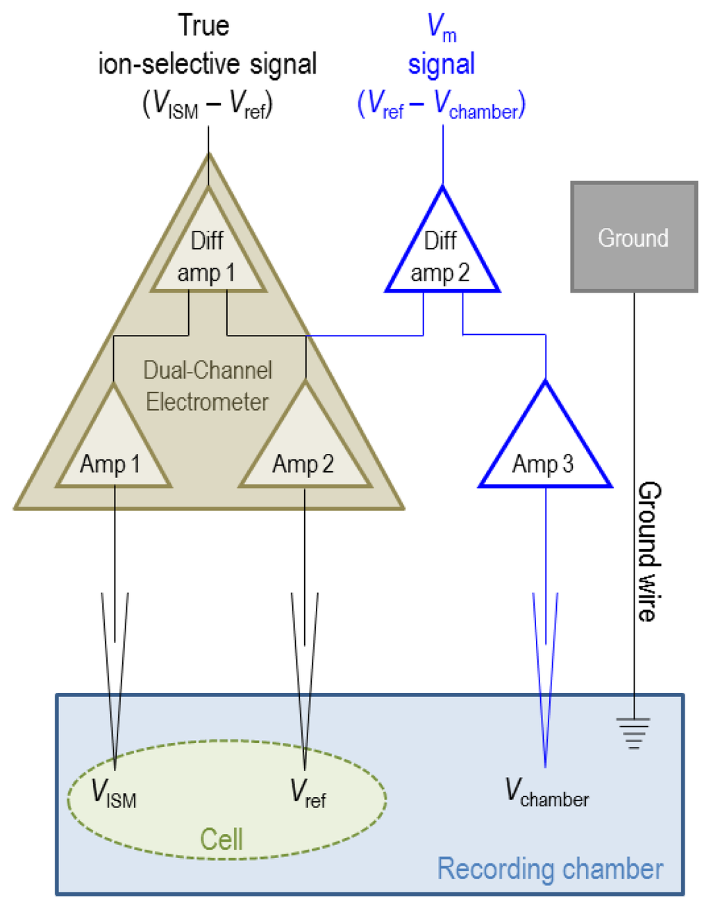Schematic of electrical configuration required to monitor the ion-selective response of an ISM (brown circuit). Amp = Amplifier, Diff amp = Differential Amplifier. The blue circuit represents optional components required to simultaneously monitor membrane potential (Vm) during intracellular recordings. Faraday shielding is also necessary, but not shown.