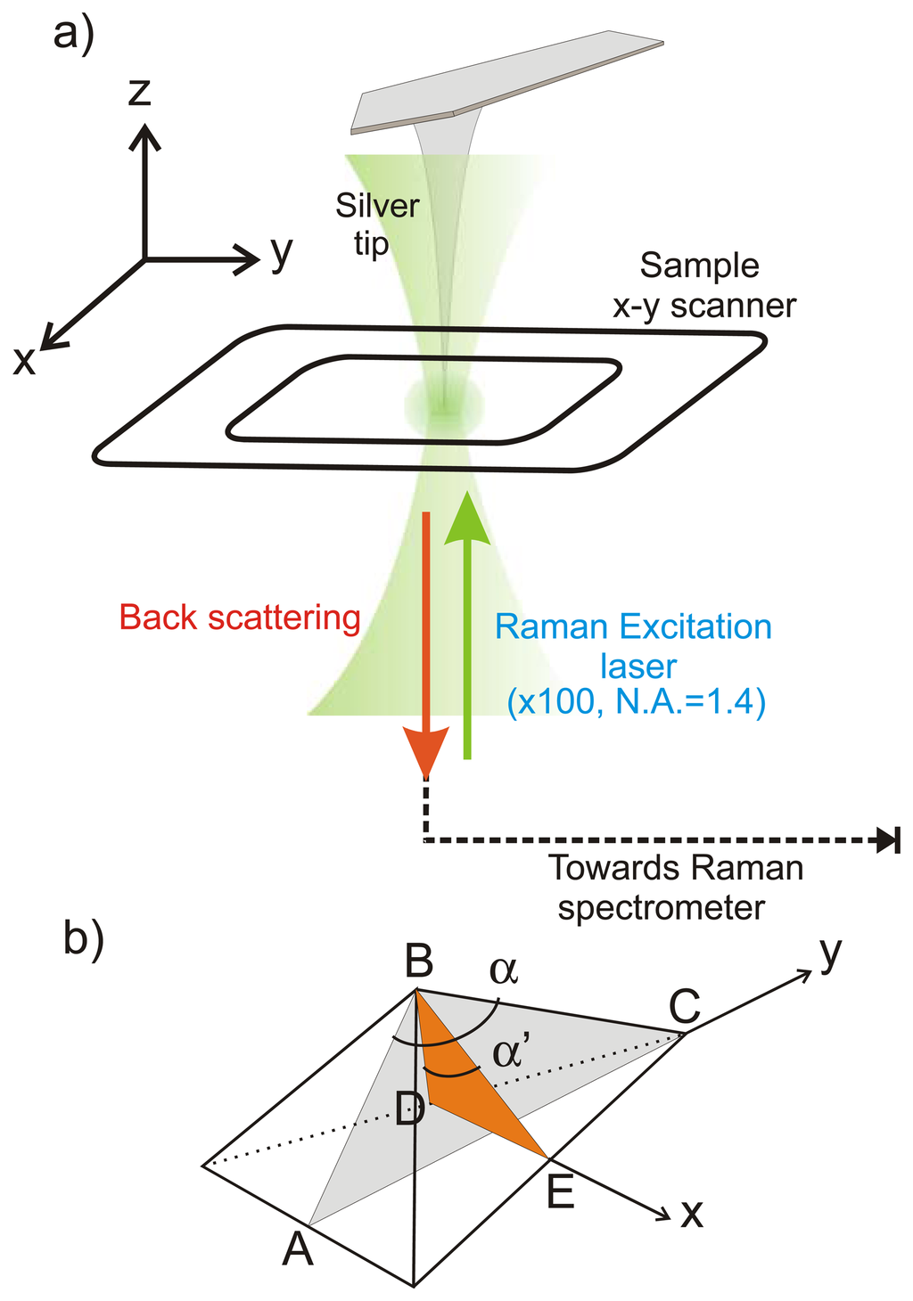 In TERS, the accessible spatial resolution depends mainly on the dimension of the tip apex which must be ideally positioned with respect to the irradiation source. Consequently, it is essential to determine the position of the tip apex in order to enable its alignment at the focal point of a tightly focused excitation laser. In this study, both vertical deflection images (Figure 3a) and Raman intensity maps of the silver-coated nanocrystalline diamond AFM cantilever (Figure 3b) have been utilized as a reliable method to find the position of the tip apex. The vertical deflection image (Figure 3a) and the Raman scattering of the tip (Figure 3b) both show clearly the tetrahedral structure of the tip. Scans of the tip over smaller area are then performed to optimize the signal and tune the position of the tip. Another approach using the Rayleigh scattering of tip can also be used to locate the tip rapidly and is complementary to vertical deflection and Raman imaging [36]. In the present study we could not record sharp Rayleigh scattering of the nanocrystalline diamond tip, presumably due to the wide angles formed by the tetrahedral tip of 125.24° and 79.34° along the Y and X axes (Figure 1b), respectively.