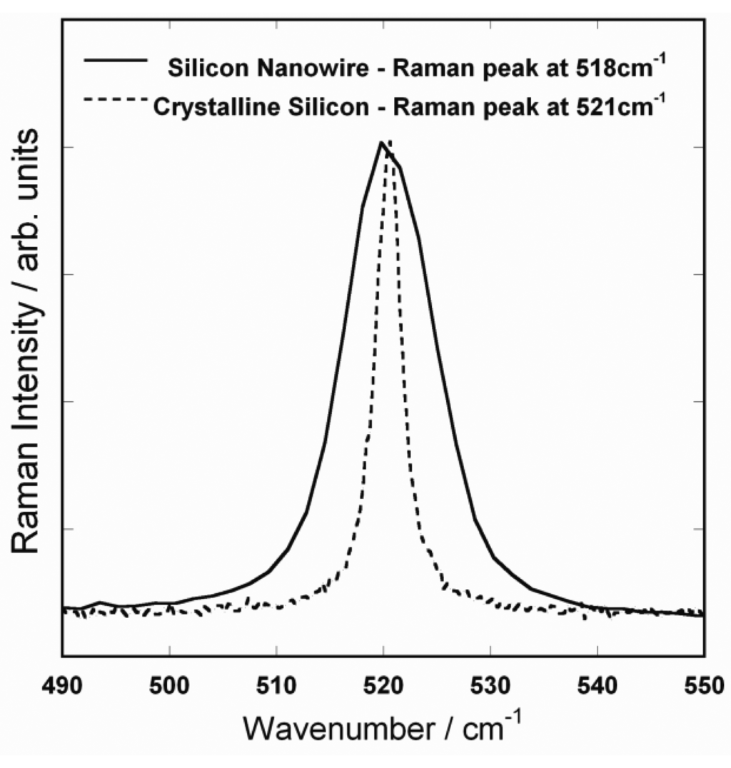 Owing to their superior electronic, optical, mechanical, thermal and chemical properties, silicon nanowires (SiNWs) have been investigated for a wide range of potential applications. Silicon nanowires exhibit excellent photo catalytic activity [1], and due to their direct path of charge transfer [2], they can be used as anode materials and improve the storage capacity of lithium ion batteries [3]. In the field of photovoltaics, SiNW-based solar cells can achieve efficient absorption of sunlight by using only 1% of the active material required in conventional solar cells [4]. Because of their poor thermal conductance, silicon nanowires can also act as efficient thermoelectric materials [5]. However, these physical properties are sensitive to the nanoscale variations in the structure of the nanowires. For example, it has been reported that surface roughness influences the thermoelectric performance of silicon nanowires [6]. Therefore it is essential to develop characterization techniques that can provide insight into the structure of the nanowires on a nanometer scale. Raman spectroscopy can serve as a powerful and sensitive characterization technique since it is sensitive to the crystal lattice structure. The shape and frequency shift of the Raman peaks may reveal useful information about the crystallinity, the amorphicity, the induced mechanical strain and even about the diameter of nanoscale silicon nanowires [7,8] as well as other semiconductor nanoscale objects [9]. Therefore, Raman spectra of silicon nanowires are of great value for understanding the properties of isolated nanowires [10].