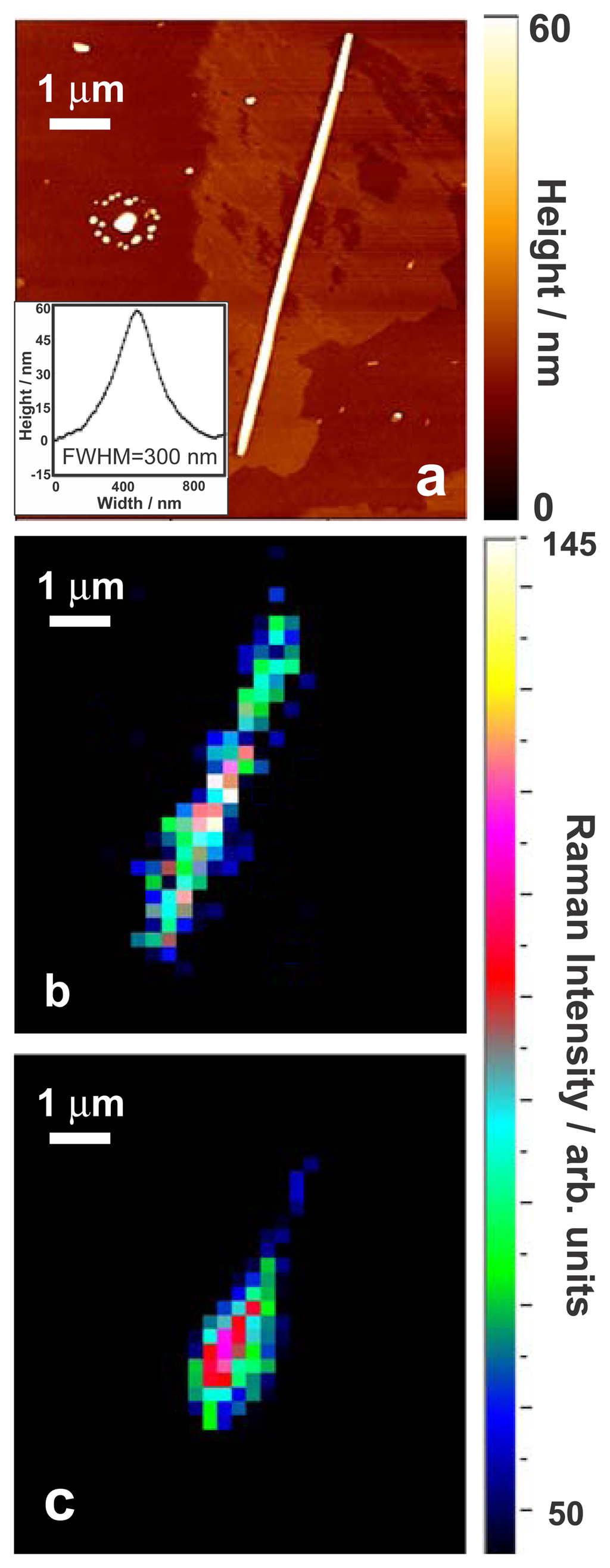 After immobilization of the tip, preliminary AFM images of the nanowire were done in order to select points to be probed. Minimum interaction between the tip and the sample was used in order to avoid any wear of the metallic coating of the tip. This weak interaction may result in poorer spatial resolution of the TERS experiment. Sharper topographical images of the wire of interest were generally collected once the TERS measurements were finished using either the same tip or using a non-coated tip. TERS spectra of various silicon nanowires were collected in non-contact mode by moving the sample in the xy plane using a piezoelectric stage. AFM image along with the topographic cross section of a given silicon nanowire is presented in Figure 4a. This image was acquired after the TERS experiments were performed.