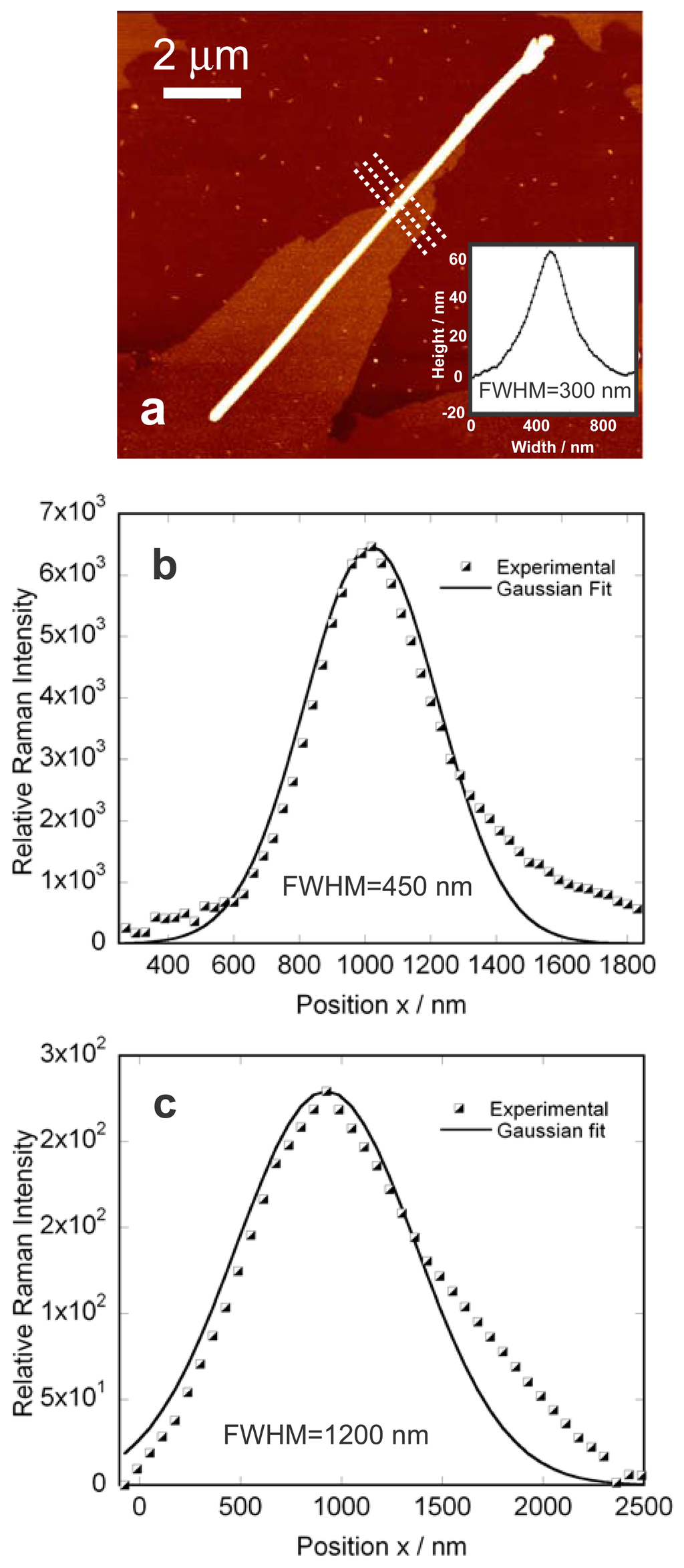 As mentioned above, the relatively large size of the mapping area makes the collection process of the spectra lengthy if the separation between the individual points in the map decreases. On the other hand, thermal effects that might be induced during a long illumination process can reduce the reliability of the acquired results. Nevertheless, it is difficult to estimate the spatial resolution reached in the near-field measurements through analyzing the data acquired using 250 nm mapping steps along the nanowire due to the uncertainty caused due to the reflection of the laser from the edges of the wire. Furthermore the measurements acquired with the tip close to the sample also include the far-field contribution that significantly broadens the spatial resolution given the short acquisition time and low signal/noise ratio. For this reason, we have scanned three short lines on a random section of a nanowire with smaller step sizes and in the orthogonal direction with respect to the long axis of the wire. The acquisition time is now 15 s/spectrum. The lines are shown in Figure 5a. Each of the three lines were 3 μm long and the step between each individual spectra was set to 30 nm in both x and y direction along the lines. By integrating the silicon peak intensity for each pixel of the map and averaging the intensity values for corresponding pixels in these three lines, the spatial resolution limit of our experiment was estimated. Figure 5a shows the AFM image of the corresponding nanowire along with the topographic cross section curve. Variations in the intensity of the silicon Raman signal with tip in and tip out averaged along three lines are presented in Figure 5b,c. The two dashed curves in Figure 5b,c present the experimentally measured Raman intensities of the total field (near + far fields with tip in) and far-field (tip out) while the solid curves are the Gaussian model which is fitted on the experimental points. In this experiment, when the tip is close to the sample the signal is significantly higher (6,000 counts) compared when the tip is out (250 counts). The optical contrast defined by C = (S tip in−S tip out)/Stip out would be in this case to ∼20. The determination of the local enhancement factor is more delicate since it implies a good knowledge of the volume of the tip that participates to the enhancement. A very broad range of values are generally reported in literature (enhancement factors varying from 10 to 104) and the imprecision over the scattering focal volumes in the optical near- and far-fields is most probably the source of the reported broad values of enhancements [13].
