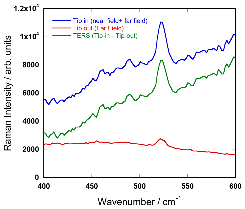 To estimate the TERS contrast of the current experiment, a series of Raman spectra were acquired at selected locations on the surface of the SiNW with an acquisition time of 10 s/spectrum. The TERS spectrum of the silicon nanowires along with the Raman spectra obtained with tip in (near+far field contribution) and tip-out (far-field contribution) of the [100] nanowire are shown in Figure 6. Here, the TERS spectrum is obtained by calculating the difference between the two experiments conducted with the tip close and far from the sample.