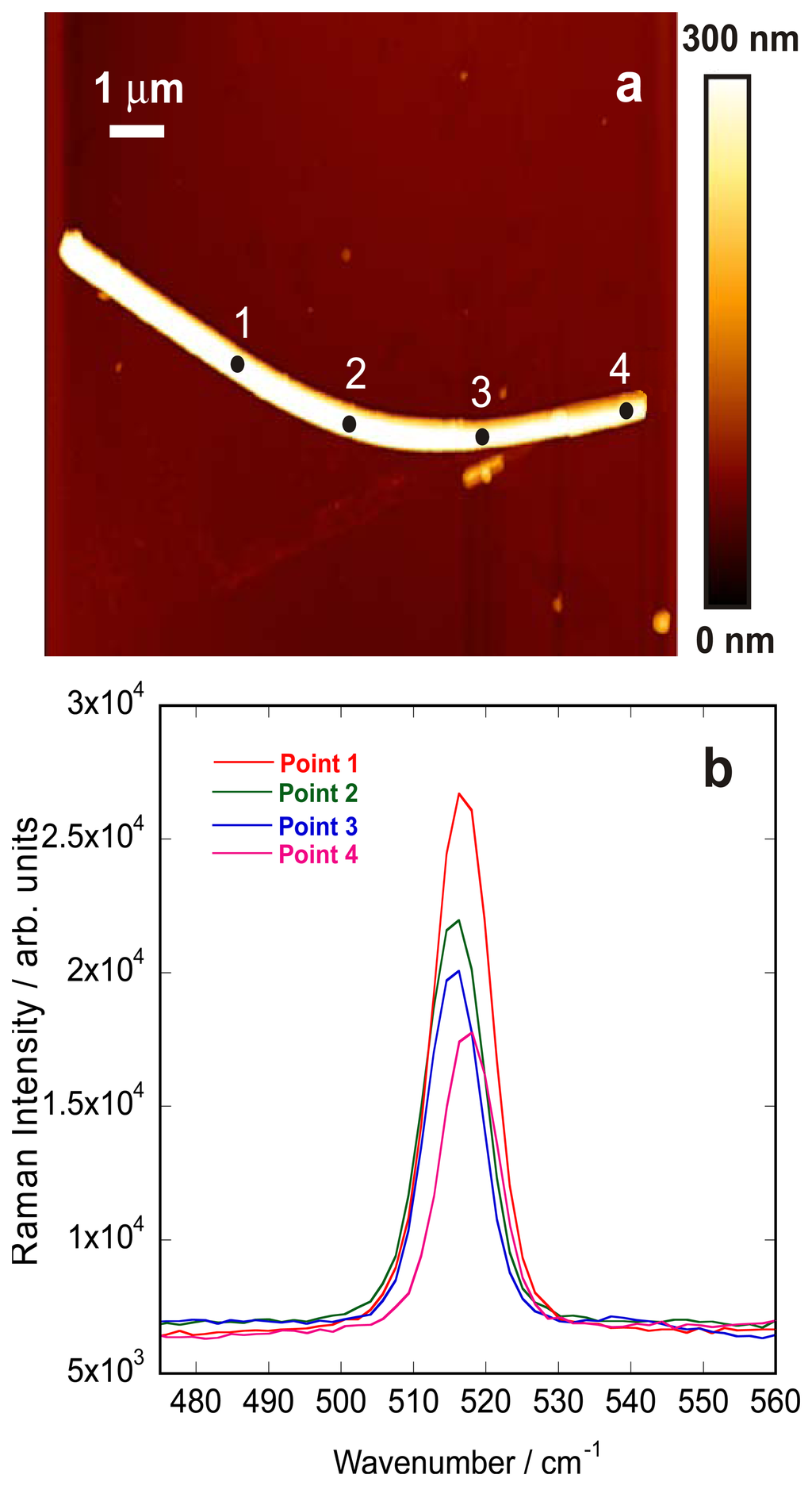 Additionally, the influence of the lattice strain on vibrational frequency shift and FWHM of silicon Raman signal was studied by TERS. Bending could be considered a source of lattice strain and previous studies have revealed a conductance enhancement in different nanowires as a result of the bending induced strain [40]. We studied the effect of this strain on the first order optical phonon Raman peak of silicon nanowires by collecting the TERS spectra at selected positions over of a bent silicon nanowire. The AFM image of this bent structure is presented in Figure 7a, while Figure 7b shows the TERS spectra obtained from different locations on this structure assigned to the nanostructure variations. The TERS Raman spectra show over 2 cm−1 shift towards lower frequencies and a slight broadening for the bent portion of the nanowire (points 2,3) as compared to the straight portions of the single wire (points 1,4). The broadening effect originates from the fact that nanowires experience compressive strain on the inner side of curvature and tensile strain on the outer side [41].