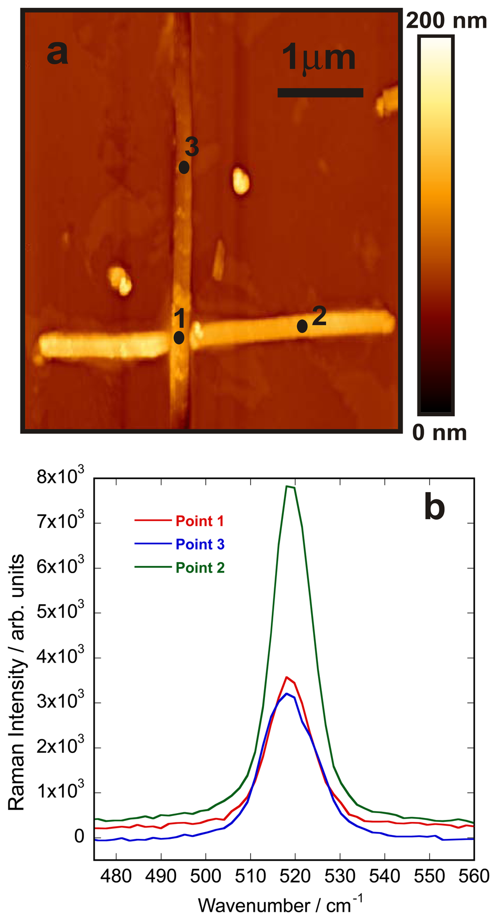 Finally the spectral variations due to potential strains induced by crossing were investigated. Crossed nanowires play an important role in fabrication of the nanodevices and it has been shown that overlapping crossed silicon nanowires make good electrical contact with each other and create electrical junctions which exhibit good diode behavior [43]. To investigate the presence of strain in the nanowires, the AFM image of arbitrary two crossed nanowires was first obtained (Figure 8a). The TERS spectra of different spots on the crossed wires were then collected and are shown in Figure 8b. The acquisition time was 10 s for each of these spectra.