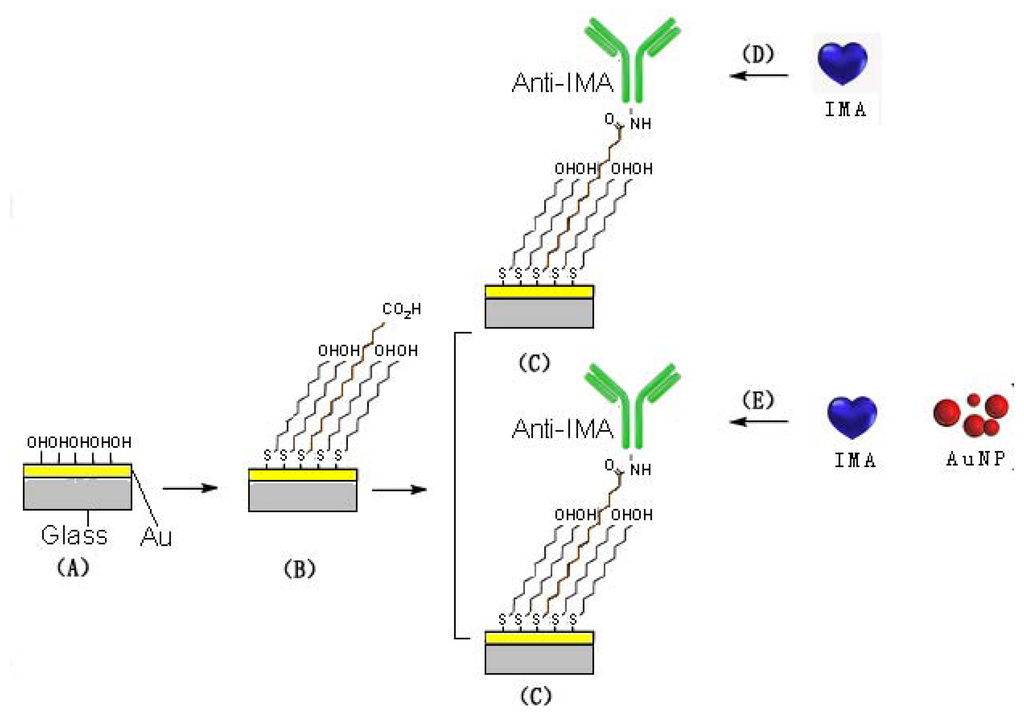 N-hydroxysuccinimide (NHS), 1-ethyl-3-(3-dimethylaminopropy) carbodiimide hydrochloride (EDC), 11-mercaptoundecanol (MUOH), 11-mercaptoundecanoic acid (MUA), 16-mercaptohexadecanoic acid (MHA), nanogold (10 nm), were obtained from Sigma-Aldrich (St. Louis, MO, USA). Ischemia Modified Albumin (IMA) was bought from Sichuan Xincheng Biological Technology Co., Ltd. (Chengdu, China). Ischemia modified albumin antibody (anti-IMA) was purchased from Shanghai Gaochuang Chemical Technology Co., Ltd. (Shanghai, China). Ethanolamine (MEA, 1 mol/L, pH = 8.5), phosphate buffer solution (PBS, 0.1 mol/L, pH = 7.4) and other reagents were all of analytical reagent grade. Response curves were aquired on a HPSPR-6000 Bioanalyzer (Xunjie, Henan, China). The sensor surface was characterized by AFM using a SPI3800N-SPA400 system (Seiko, Japan).