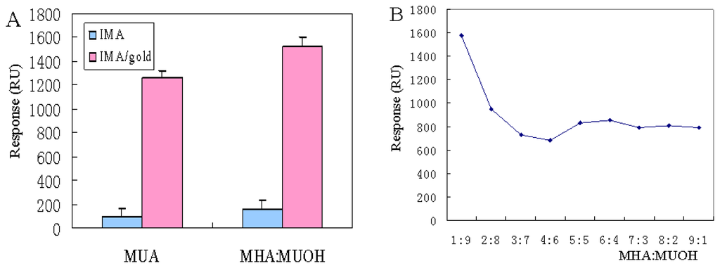 Thus, we chose the mixture as the replacement for carboxymethylated dextran, whereas the optimized ratio of mSAM was still under discussion. Different mSAMs were formed by immersing chips into solutions containing MHA and MUOH at a ratio of 1:9, 2:8, 3:7, 4:6, 5:5, 6:4, 7:3, 8:2, 9:1. Results indicated that when the ratio was 1:9, the binding exhibited the highest SPR responses (Figure 2B). Hydroxyl-terminated SAMs (MUOH) decreased non-specific binding and were utilized as spacers to form the chip surface, while carboxyl-terminated SAMs (MHA) were exploited as functional linkers to immobilize IMA for immunoassays. Because of steric hindrance, bulk massed carboxyl groups showed reduced reactivity compared with the small sized hydroxyl groups. Choi [23] reported that two heterogeneous chain lengths resulted in less steric hindrance. Tamada [24] also demonstrated that longer carbon chains produced rougher surfaces than shorter chains. As the carbonchain length increased, a phase segregation occurred from order to disorder. A rough surface was formed through van der Waals attraction between the chains and therefore raised the surface reactivity.