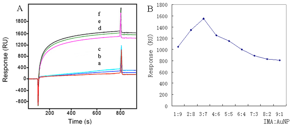 The effect of different ratios of IMA:AuNP on signal enhancement was also investigated. Signal enhancement depended crucially on the particle size which was composed of AuNP and surrounding IMA molecules. Appropriate ratios might increase the chances of the particles binding to the surface. As shown in Figure 3B, the optimal here was chosen to be 3:7 (v/v).