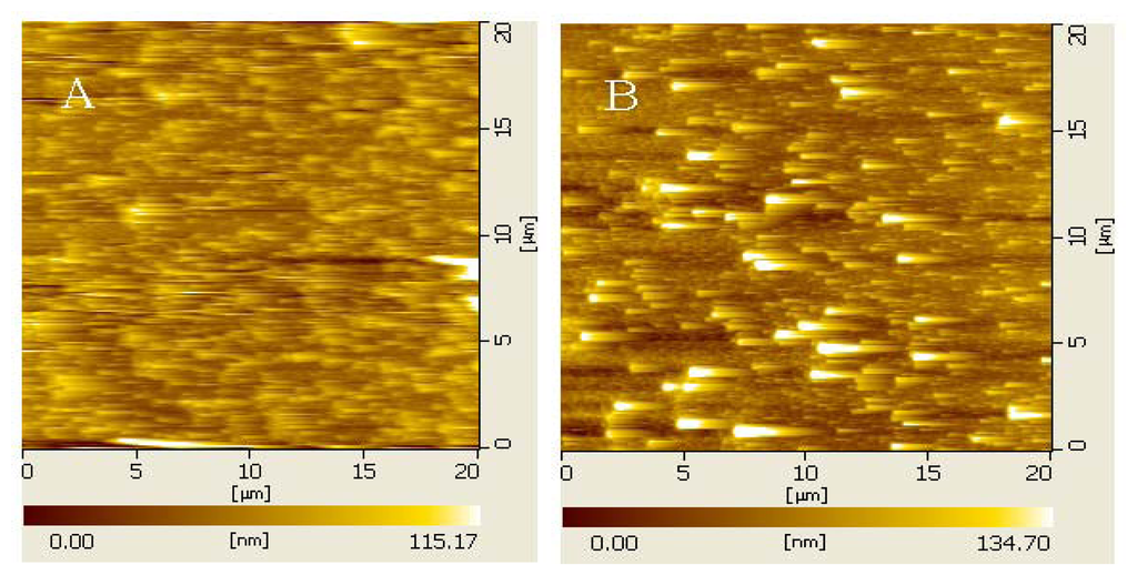 Figure 4. AFM images of silicon chip substrate modified with IMA at concentration of 25 μg/L (A) and IMA–AuNP complex of 25 μg/L (B).