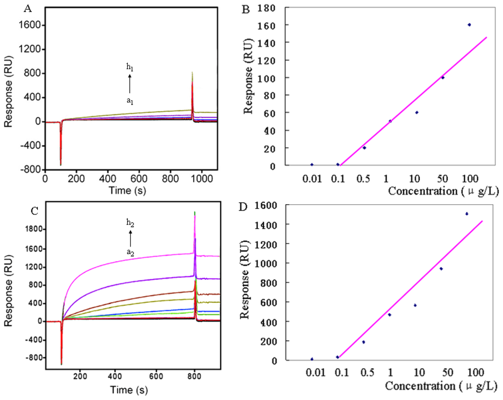 In the SPR sensing system, IMA firstly bound to the anti-IMA immobilized on the chip surface (Format A), then the mixture IMA-AuNP was inserted (Format B). In order to clarify the analytical performance of the biosensor proposed in this work, experiments were carried out with series of IMA concentrations. Significant signals were obtained with inserting in two formats and their signal values were also well consistent with the enhancement theory at high and low concentration. In Figure 5, the response signal increased with the increase of IMA concentration. Moreover, the time required for binding was only 4 min, with this procedure no labeling is required and the target can be detected in real-time. The two formats (A, direct assay; B, AuNP enhanced assay) were also evaluated (Figure 5B,D).