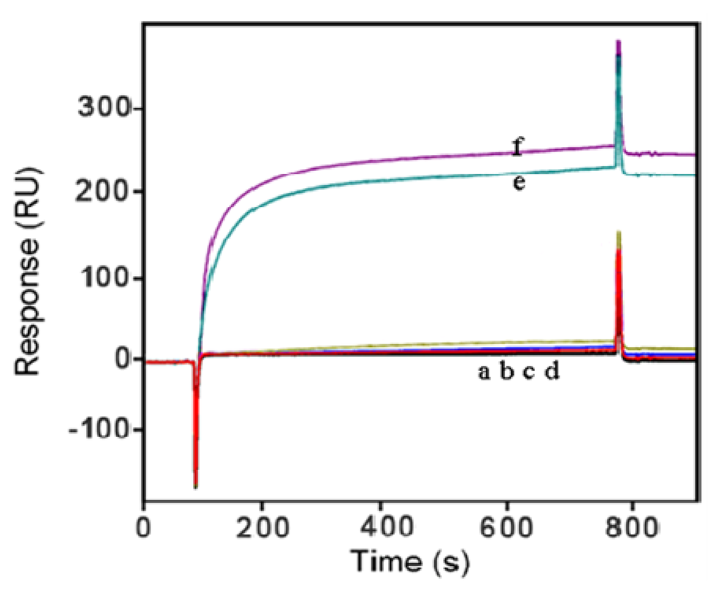 Meanwhile, Hep solution (500 ng/L) in PBS buffer was prepared and passed over the Anti-IMA modified surface for 10 min, Hb, Bil and TG were also tested in a sequential injection procedure similar to Hep (Figure 6). The results showed that hardly any signal improvement was observed, that is to say, this approach has been proved to be reliable with its high selectivity.