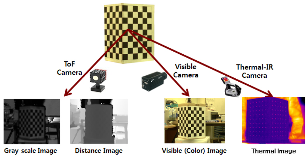 We measured re-projection errors at different visual and thermal-IR camera positions, but with the ToF camera fixed. The mean values of 30 repetitions of re-projection errors with the visual and thermal-IR camera are 2.7308 pixels and 1.5629 pixels, respectively. Since the resolution of the visual image is larger than that of the thermal-IR image, the re-projection error of the visual image is more sensitive to noise than the thermal-IR image. There are many reasons why re-projection error is generated. First, the low resolution (176 × 144) of the ToF camera causes more error in high-resolution images during the feature extraction step. Second, even though an average of 30 distance images is used to extract 3D points, the values still might contain distance noise. Therefore, distance noise estimation and precise feature extraction algorithms are needed to estimate precise projection matrices.