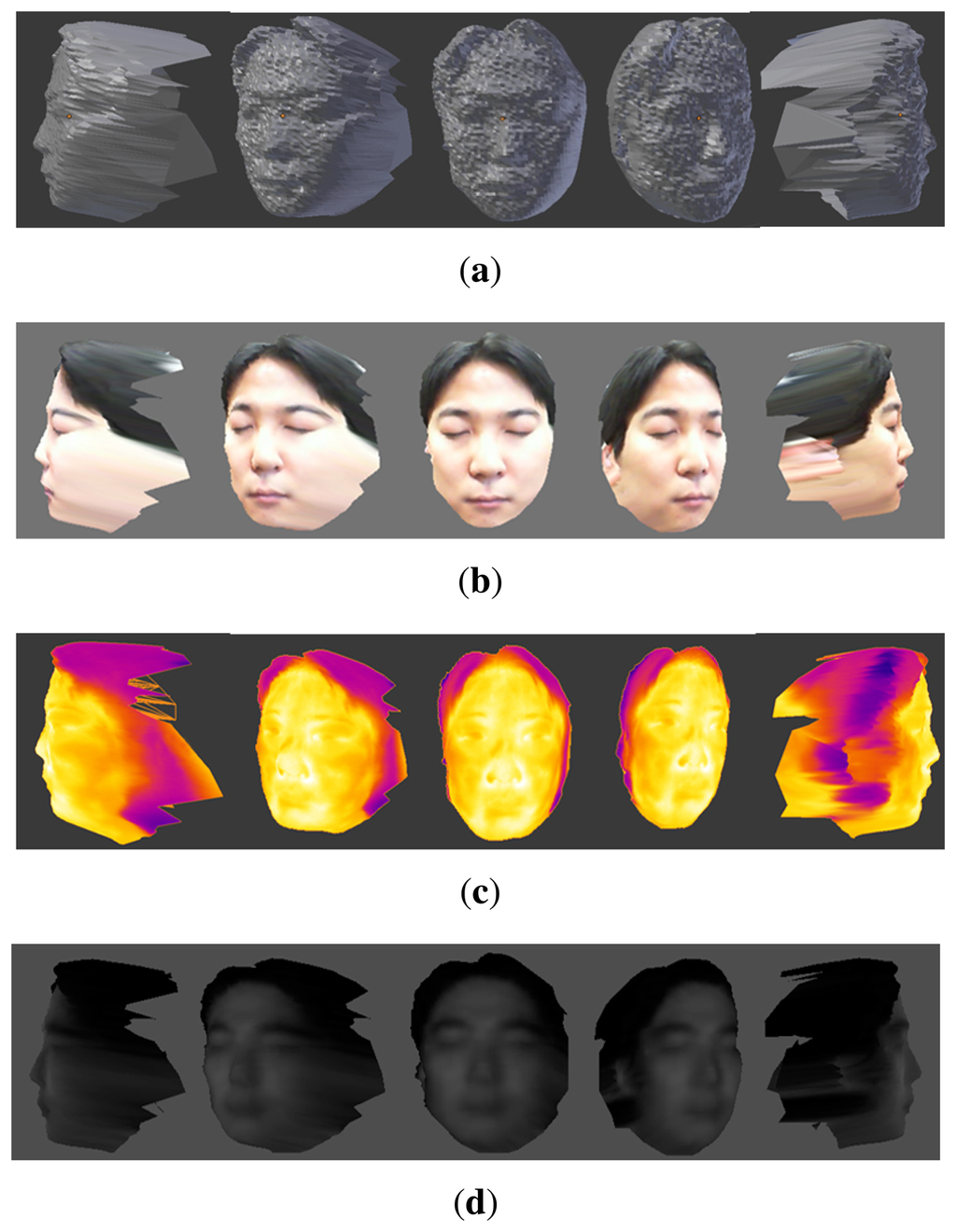 As a result of the registration, 3D multi-spectrum face data for face recognition can be generated. Since the resolution of the depth image from the ToF camera is too small, we generate 3D multi-spectrum face data by 3D mesh rendering in OpenGL to create more detailed 3D face data. Figure 10a shows visible and thermal-IR images, as well as two kinds of 3D multi-spectrum data. One image is color textured (Figure 10b) and the other is thermal-IR textured (Figure 10c). Since the coordinate of the distance image corresponds perfectly with the coordinate of the near-IR image, 3D multi-spectrum face data, including near-IR texture information, can also be generated, as shown in Figure 10d.