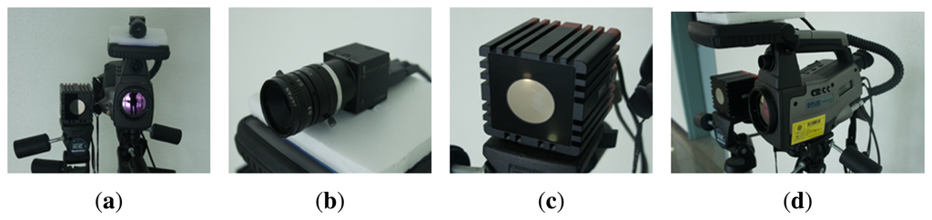 In order to obtain 3D information and near-IR images in real-time, we use a SR-4000 ToF camera with MESAimaging that can provide a resolution of 176 × 144 pixels at 30 FPS. Color images of the scene are captured using a FL2 by Point Grey that provides a resolution of 1, 024×768 pixels at 30 FPS. Thermal-IR images are acquired from a ThermaCAM S65 with an FLIRsystem that has a resolution of 320 × 240 pixels at 50/60 Hz. Since each sensor operates with a different frame rate, we need to set temporal synchronization among the sensors. We adjust the timing for the image capturing of visual and thermal-IR cameras to the timing of the image capturing of the ToF camera. The SR-4000 ToF camera supports a software trigger mode that uses the callback mechanism to capture depth images. When the callback function is called upon, all images are captured by multi-thread. Although we had tried to set the temporal correspondence by multi-thread, 2D image capturing and depth image capturing are, respectively, started with a small time difference, which is about 1msec. Figure 12 shows the installation of the three cameras. The ToF camera in Figure 12c is positioned to the right of the thermal-IR and visible cameras. The visible camera in Figure 12b is set next to the thermal-IR camera, as shown in Figure 12d. Each camera is located as close as possible to reduce occlusion caused by the different camera positions.