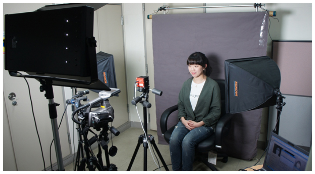 Figure 13 shows our experimental environments. The distance between the face image to be acquired and the cameras is set at 1 m. Three light sources are used to create light variation. In addition, a dark screen is installed in the background to make it easy to separate face images from the background.