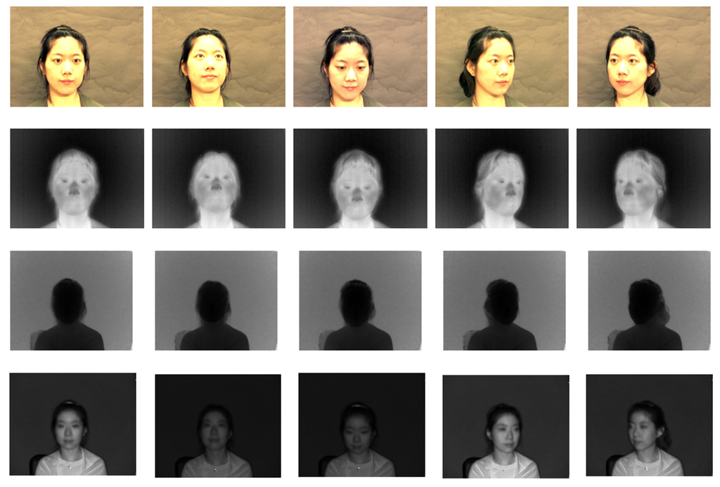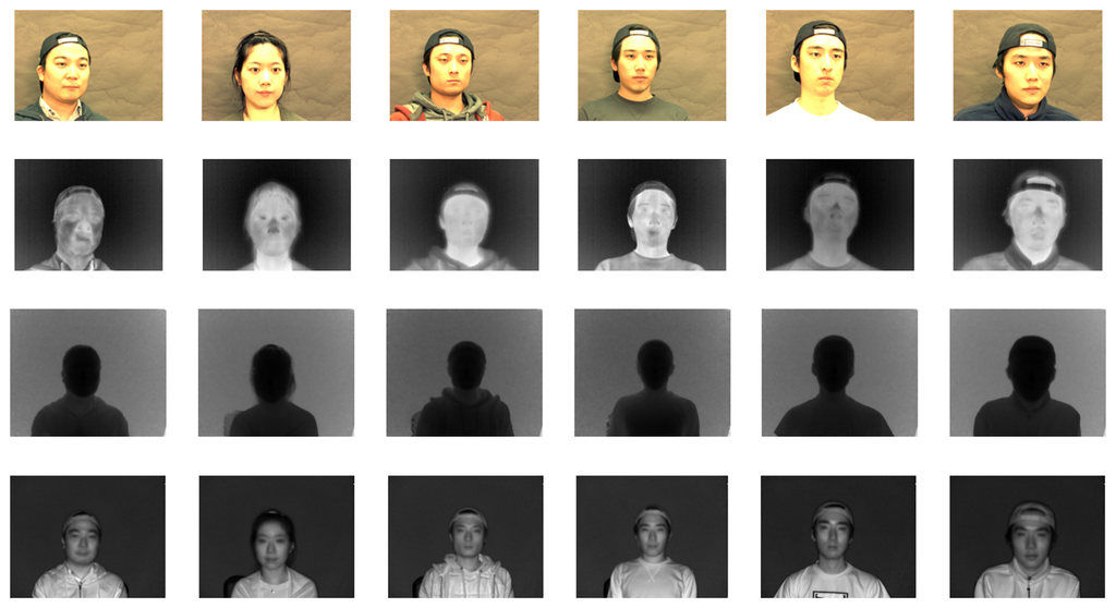 Even though the data acquisition system is implemented in C, OpenGLand OpenCV, which is a real-time processing library for computer vision by Intel, other steps, including normalization and recognition, were simulated using Matlab 2009b on a machine with a 2.93 GHz Intel Core i7 870 and 4 GB of physical memory. Since there is no public facing database that includes all registered 3D, visible and thermal-IR information with variable illumination and pose conditions, we created two databases with five different poses and five levels of light variation. All images for the database are captured indoor with daylight conditions. Each database contains 500 3D multi-spectrum face datasets obtained from 100 subjects (5 (variations) × 100 (subjects) = 500). We detect face region using the Viola-Jones face detector, which was implemented using OpenCV [53]. All face images are normalized to 50 × 50 pixels for recognition. Figure 14 shows sample images from our database, which consists of distance, visible and thermal-IR images. The first row in Figure 14 shows color (RGB) images from the FL2 camera. The second row shows the thermal-IR images captured by the ThermaCAM S65. The third and fourth rows show the distance and near-IR images, respectively, from the SR-4000 ToF camera.