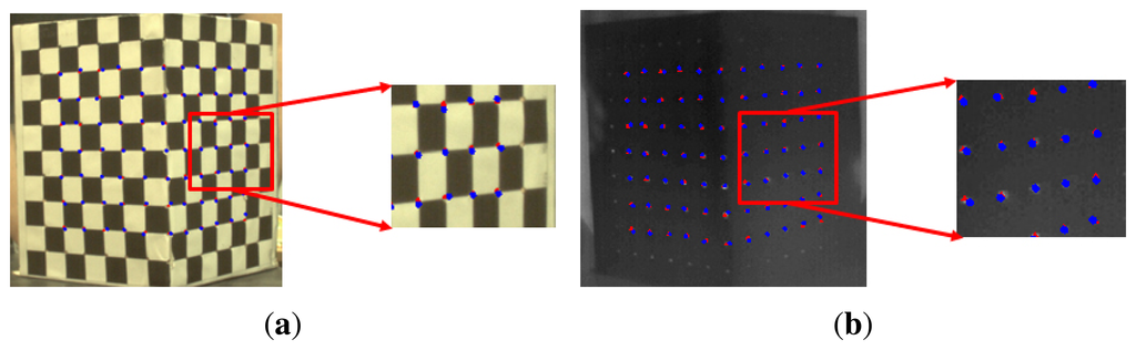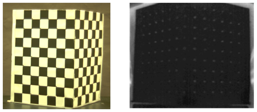 To estimate each projection matrix in an off-line process, the corresponding points having the same feature point in all three cameras should be extracted. To identify the corresponding points between different cameras, we use a calibration rig to extract feature points at the corners of a check pattern in a color image. We also make holes in the corners of the check pattern as feature points for the thermal-IR image. The 2D points (xC, xT) for color and thermal-IR can be extracted from each image of the calibration rig shown in Figure 7.