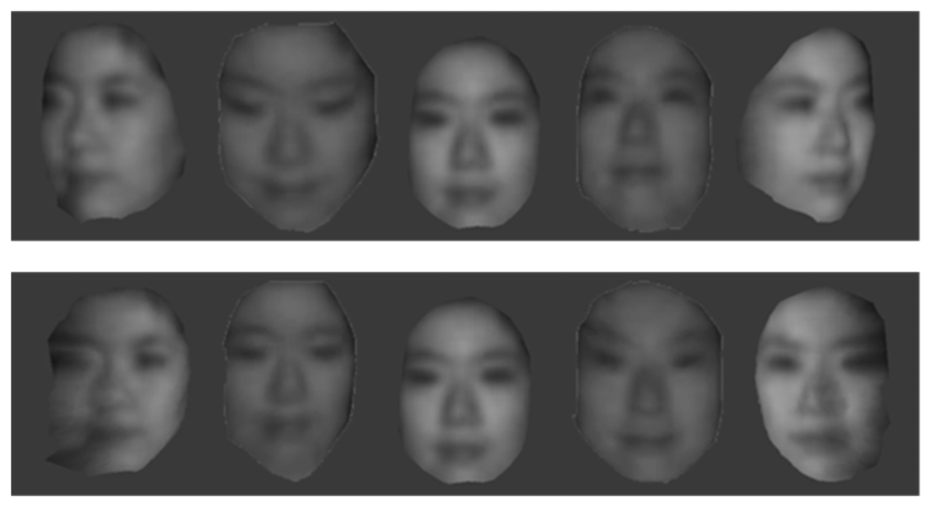 The experiments are performed using five-fold cross-validation, meaning that one face image is used for testing, and the other four face images are used for training to verify the face image. Therefore, 400 images were used for training, and 100 were used for testing. The experimental methods are the same as for face recognition with pose variation.