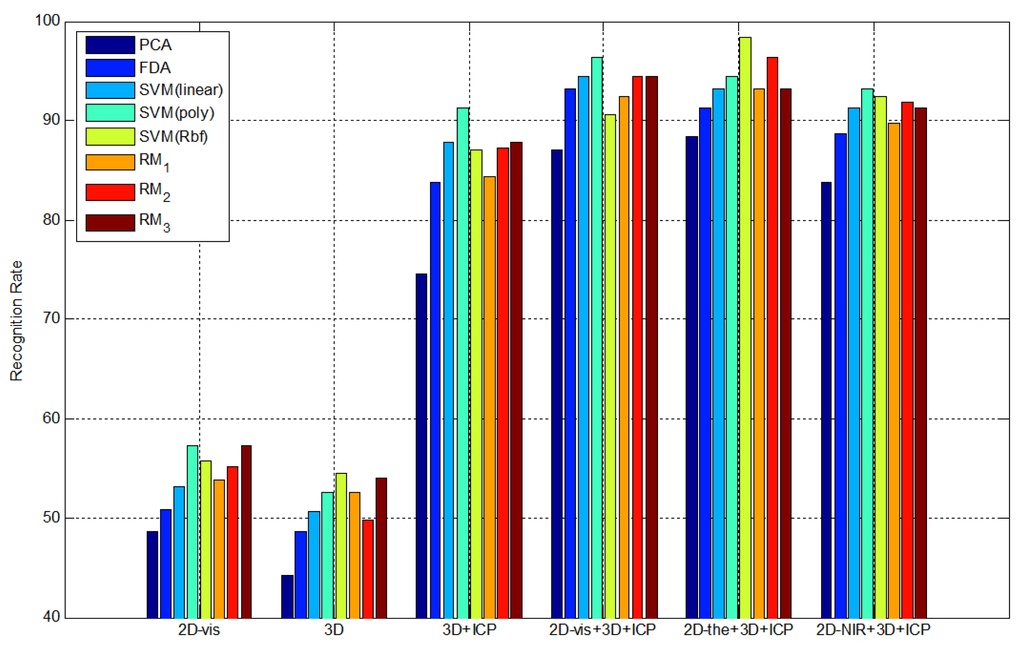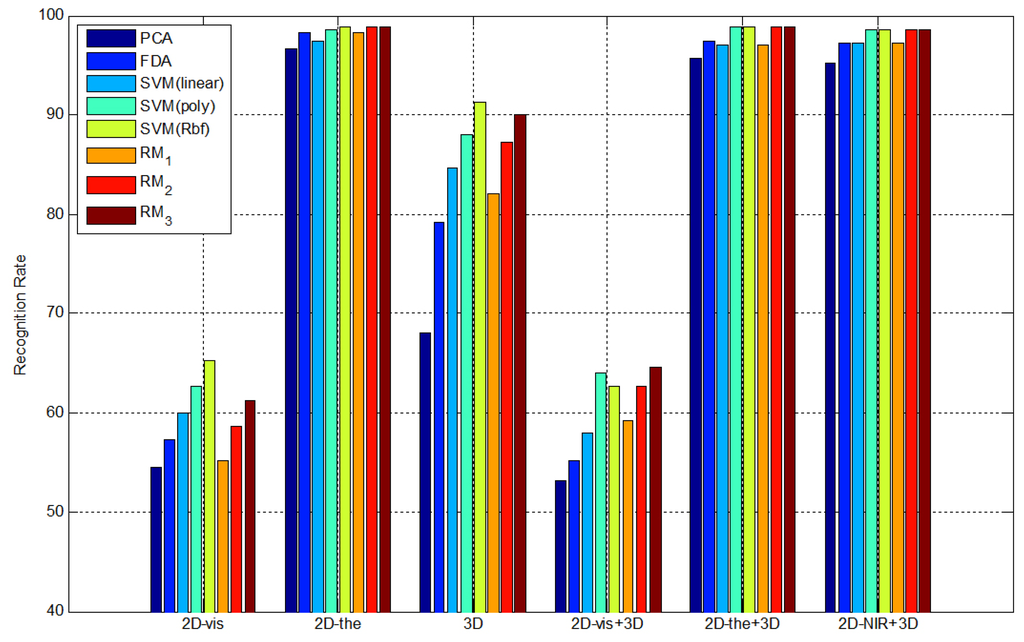 Based on these experiments, we can solve the pose variation problem by normalizing the 3D face data. Since there is no light variation to evaluate in this experiment, the result of using 3D visible face data (4), and 3D thermal-IR face data (5) yield similar recognition rates as the highest recognition rate, as shown in Figure 20. Even though the result of (3) uses 3D information, the recognition rate is not as high, because the range images from the ToF camera contain more distance noise. Among the classifiers, the SVM and RM classifiers show the best recognition rate.