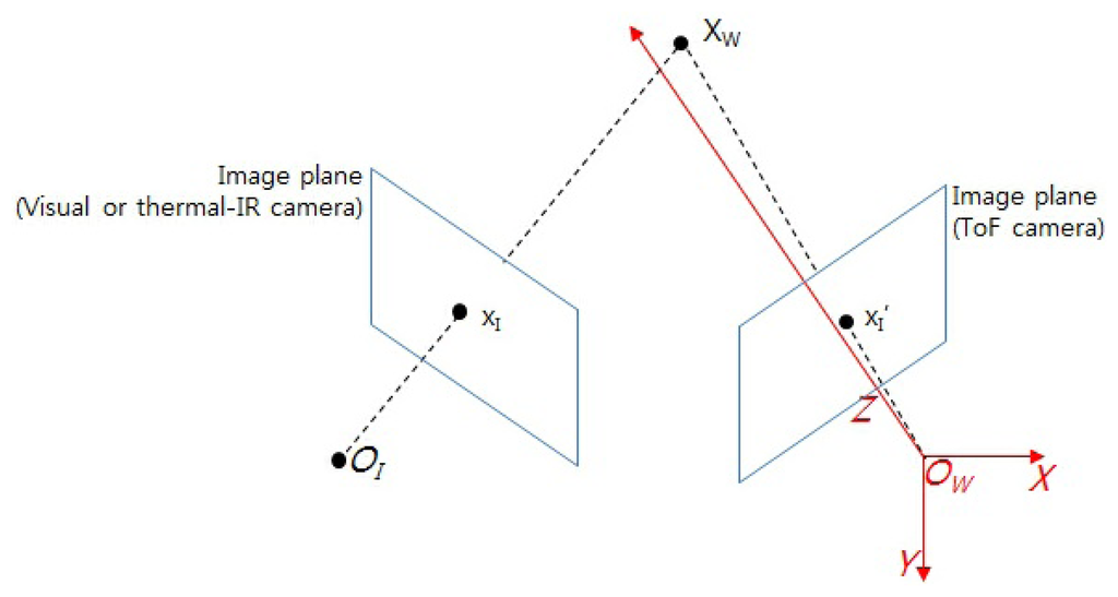 Three-dimensional geometry, in which a 3D point (XW) in a world coordinate system is projected onto a 2D point (xI) in an image coordinate system, is used for registration between visible or thermal-IR and ToF cameras. As shown in Figure 3, since the origin of the world coordinate (OW) is the same as the origin of the ToF camera, a point in the world coordinate system can be represented as the camera coordinate system of the ToF camera. In other words, a world coordinate of a point in 3D space is directly acquired as the 3D point of the ToF camera, as described in Equation (1). Additionally, xI represents a 2D coordinate of the image (pixel) coordinate system of the visible camera. is a 2D coordinate of the image coordinate system of the ToF camera.