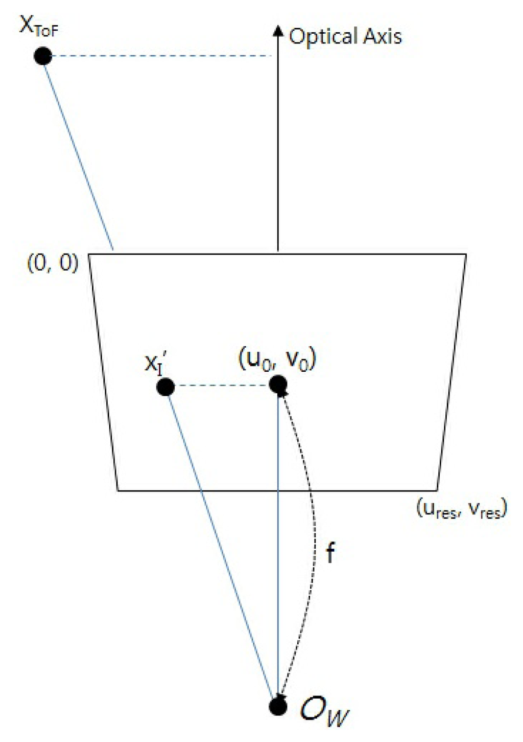 A 3D point (XToF) is projected onto a 2D point ( ) on the image plane. Since the pixel value of a distance image from the ToF camera represents the distance between the camera and an object, we can obtain the distance information (z) from the images. Therefore, we can estimate the x-coordinate of the 3D point (XToF) according to Equations (4) and (5). f is the focal length of the ToF camera, which can be calculated from the camera calibration [47].