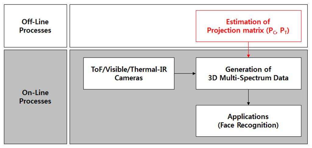 We divide the proposed system into on-line and off-line steps, as shown in Figure 5. Before the on-line process, the projection matrices, which represent the relationship between the 3D coordinates of the ToF camera and the 2D projective coordinate of the visible (PC) and thermal-IR (PT) cameras, should be estimated off-line. Subsequently, 3D multi-spectrum data are generated and applications, such as face recognition, are completed on-line.