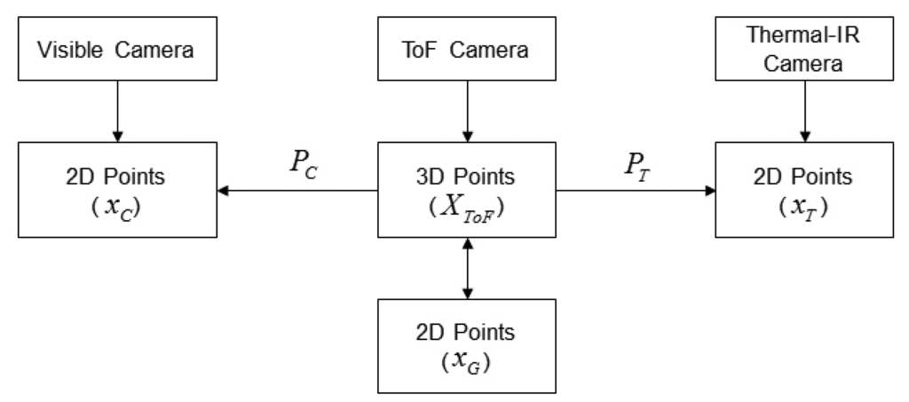 In the proposed system, 3D points can be acquired from the ToF camera, and two kinds of 2D points can be obtained from the color and thermal-IR cameras. Therefore, the two camera projection matrices can be correctly estimated. One is a matrix (PC) representing the relationship between the 3D points and 2D points of the color images, as in Equation (11), and the other is a matrix (PT) based on the 2D points of the thermal-IR images, as in Equation (12).