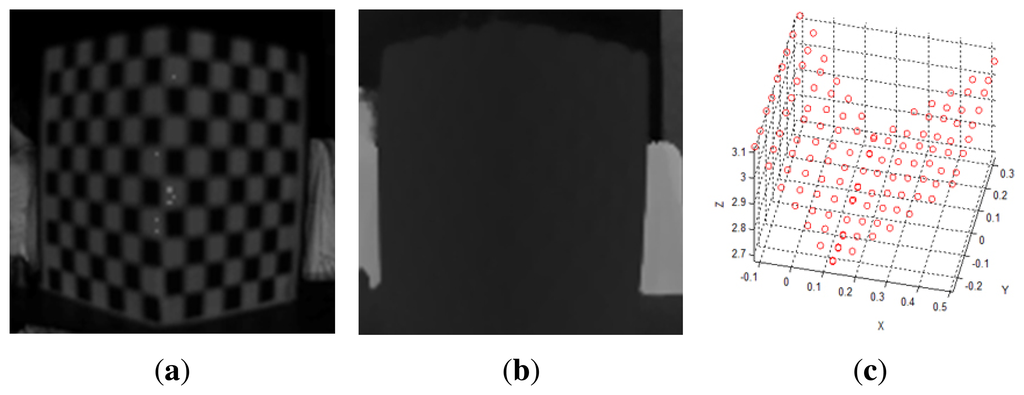 Using a ToF camera, 3D points (XToF) can be acquired directly, since the distance image has already been calibrated using the 2D points (xG) of the near-IR image from the ToF camera (Figure 8). Therefore, we first extract the feature points that are also the corner points of the check pattern in the near-IR image, as shown in Figure 8a. By using the points extracted from the near-IR images, the 3D coordinates can be extracted from the distance image, as in Figure 8b, as well as from the ToF camera, as shown in Figure 8c.