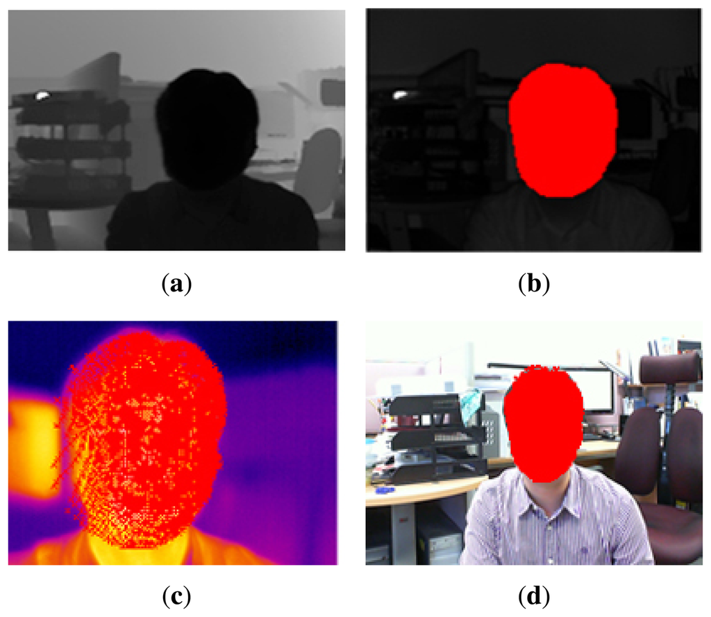 Figure 9 shows the corresponding distance image (3D shape information) (a) and near-IR image (b) of the thermal-IR image (c) and visible image (d). The red-cross points in Figure 9c,d represent projected correspondence points on the thermal-IR and visible images from the 3D face region in (b).