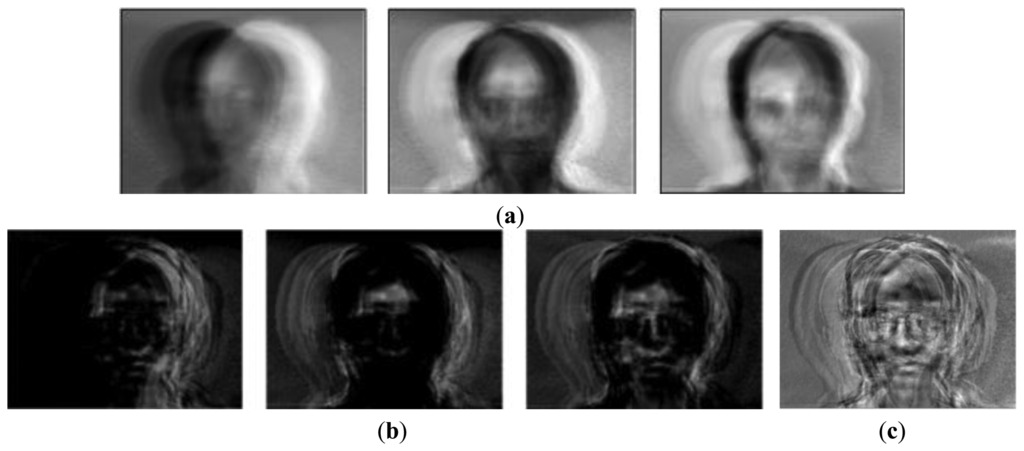 Figure 3c shows that the Or1 face emphasized the facial outlines or edges as mentioned in Chen's experiments. In this figure, the white pixels represent the important features (basis face) since they are close to 255. This is because these white pixels were emphasized when they were multiplied with the images in Equation (1). On the other hand, Figure 3b,e show the first (RR1) and second (RR2) basis faces that have small values of U (0.264, 0.271) via the proposed method, respectively. Figure 3f shows that the important features are related not to the illumination but to the pure faces (RR2), since the eigenfaces (Or2) with high asymmetry values seem to be influenced by the light. This is possible because our method excluded the edge basis faces (outlines) by increasing their weights.