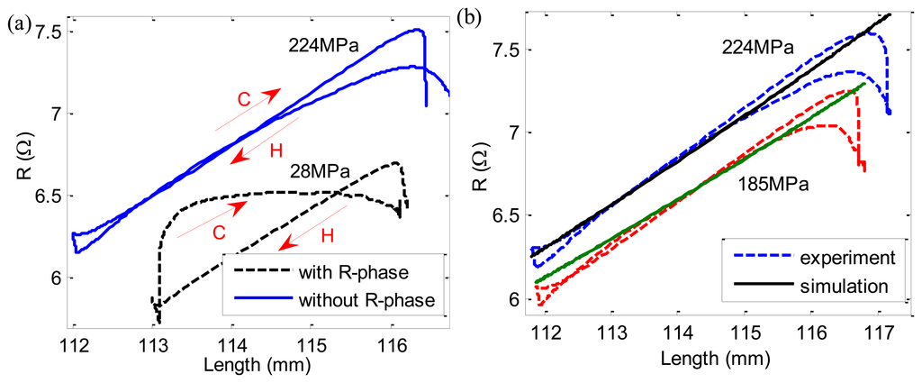 The experimental resistance-length (R-L) curves are shown in Figure 10a. When the applied stress is large, R-phase is inhibited and the linearity of R-L curve is quite good and the hysteresis gap of heating and cooling path is also small. However, when the applied stress is small, the resistance-length curve has two different steps with very different slopes during cooling caused by R-phase, which is not convenient for self-sensing application. Here we are only concerned with the case without R-phase. Assuming the initial length of SMA wire is l0, then: