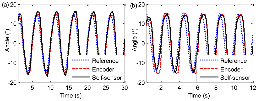 The resistance of the SMA wire is measured as the feedback signal and then converted to the ankle angle combining the self-sensing model (Equations (20) and (21)) with Equation (22). Furthermore, the actual angle is also used for the feedback control as a comparison. Figure 14a shows the results of sinusoidal tracking response experiments using the self-sensor and encoder respectively at 0.2 Hz. Note that, the “Reference” angle θref is the desired sinusoidal curve produced by host PC. The “Encoder” angle is the actual curve sensed by an encoder, and the “Self-sensor” angle is the actual curve sensed by the self-sensing model. The actual angle with the two feedback methods can accurately follow the reference angle, which demonstrates the validity of the self-sensing method. When the sinusoidal frequency increases to 0.5 Hz as shown in Figure 14b, a small phase lag appears between the actual angle and the reference angle. But the two actual angle curves coincide well with each other, because both resistance and length change of SMA wires are closely related to SMA transformation, which further demonstrates the validity of the self-sensing model.