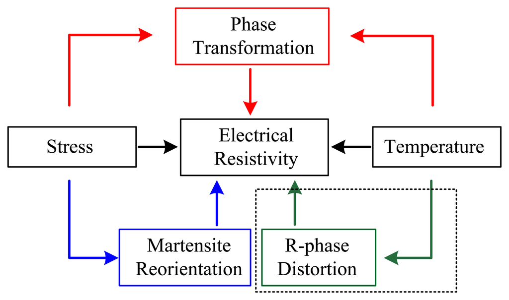 For a certain given SMA wire, ER variations not only depend on the direct effects of stress and temperature, but also on stress and/or temperature induced phase transformation, martensite reorientation and R-phase distortion. The detailed relationships of the influencing factors on ER variations are shown in Figure 2. As with common metals, the ER of SMA changes linearly with temperature and stress at stable individual phases (black arrow) since SMA is a metal. However, the ER is also closely related to phase transformation induced by stress and/or temperature (red arrow), and martensite reorientation induced by applied stress (blue arrow), which is in contrast to the behavior of common metals. Besides, when the R-phase appears in SMA, the ER also changes linearly with R-phase distortion induced by temperature (green arrow). Consequently, ER variations are attributed to the direct and indirect effect of stress and/or temperature for a certain given SMA wire. In this study, equiatomic NiTi wires were investigated as the sample obtained from Dynalloy, Inc. (Tustin, CA, USA).