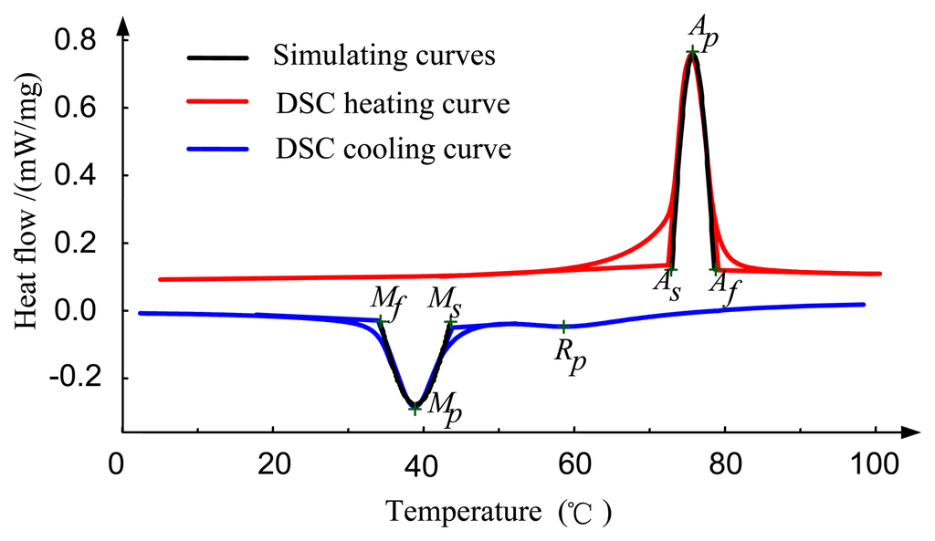 In order to clarify thermal transformation behavior of SMA, we use a “Cosine curve” to simulate relationship between heat flow and temperature during transformation as shown in Figure 3 (black line). This approach relies on the notion that the gradual phase transformation may be represented by relatively symmetric DSC peaks. Here reverse transformation is taken as a case study and the expression for heat flow and temperature is given as follows: